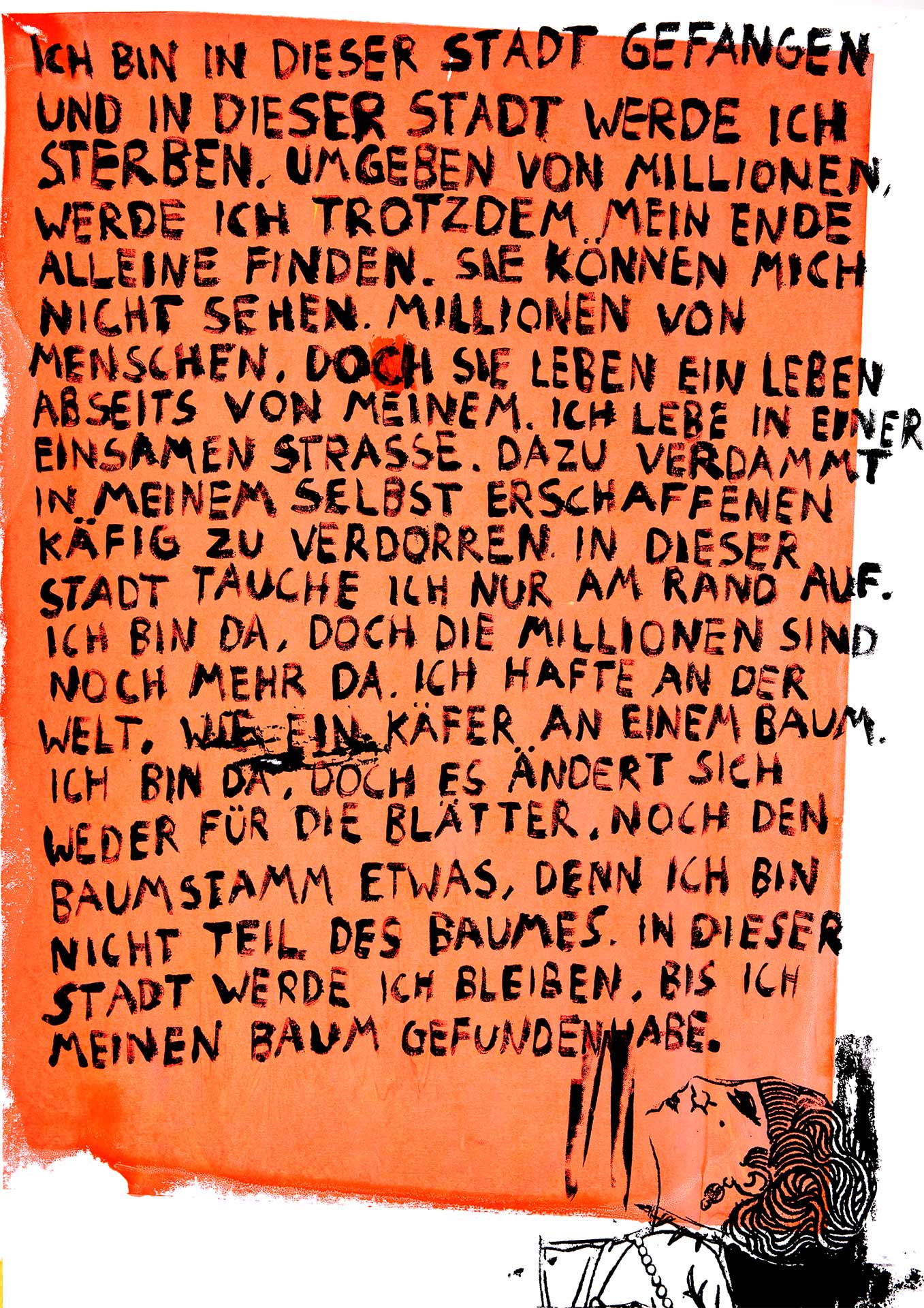 This illustrated work was based on poems and texts that I wrote over a longer period of time. They deal with themes that I was currently preoccupied with, themes such as abandonment, loss of control, loneliness and confusion. The creative basis were collages that I made from old magazines and booklets, over which I also drew with ink. From these collages, I ultimately produced a series of multicolour posters, which I made using the silk-screen printing technique.