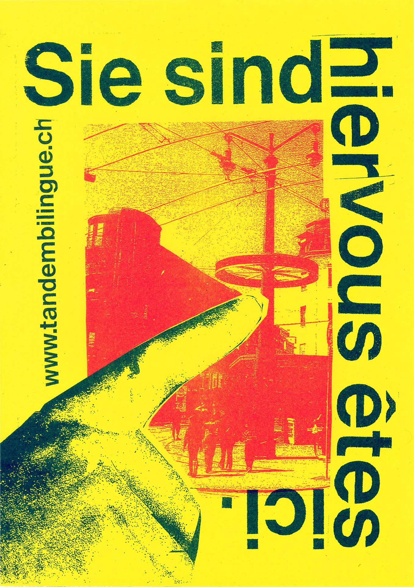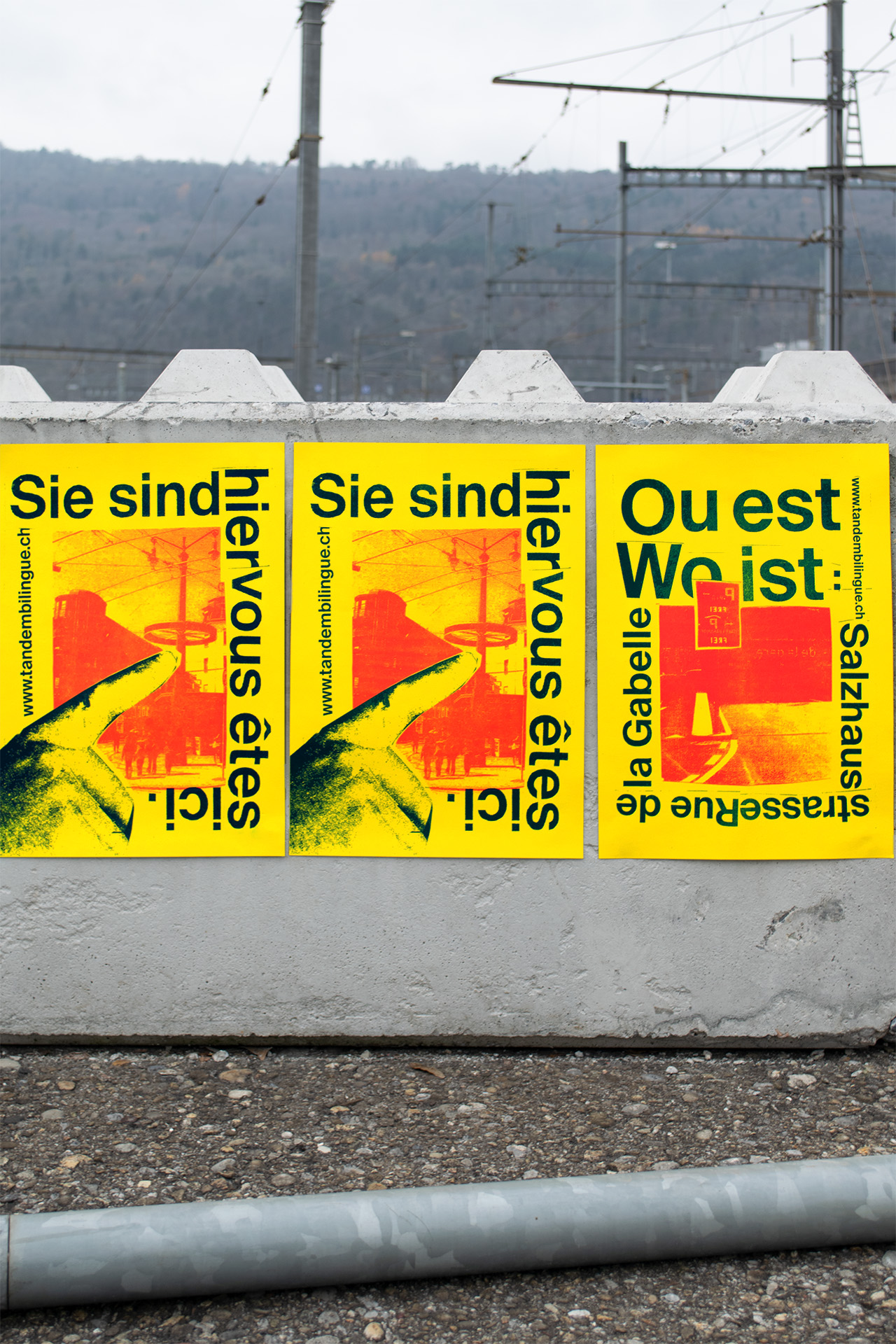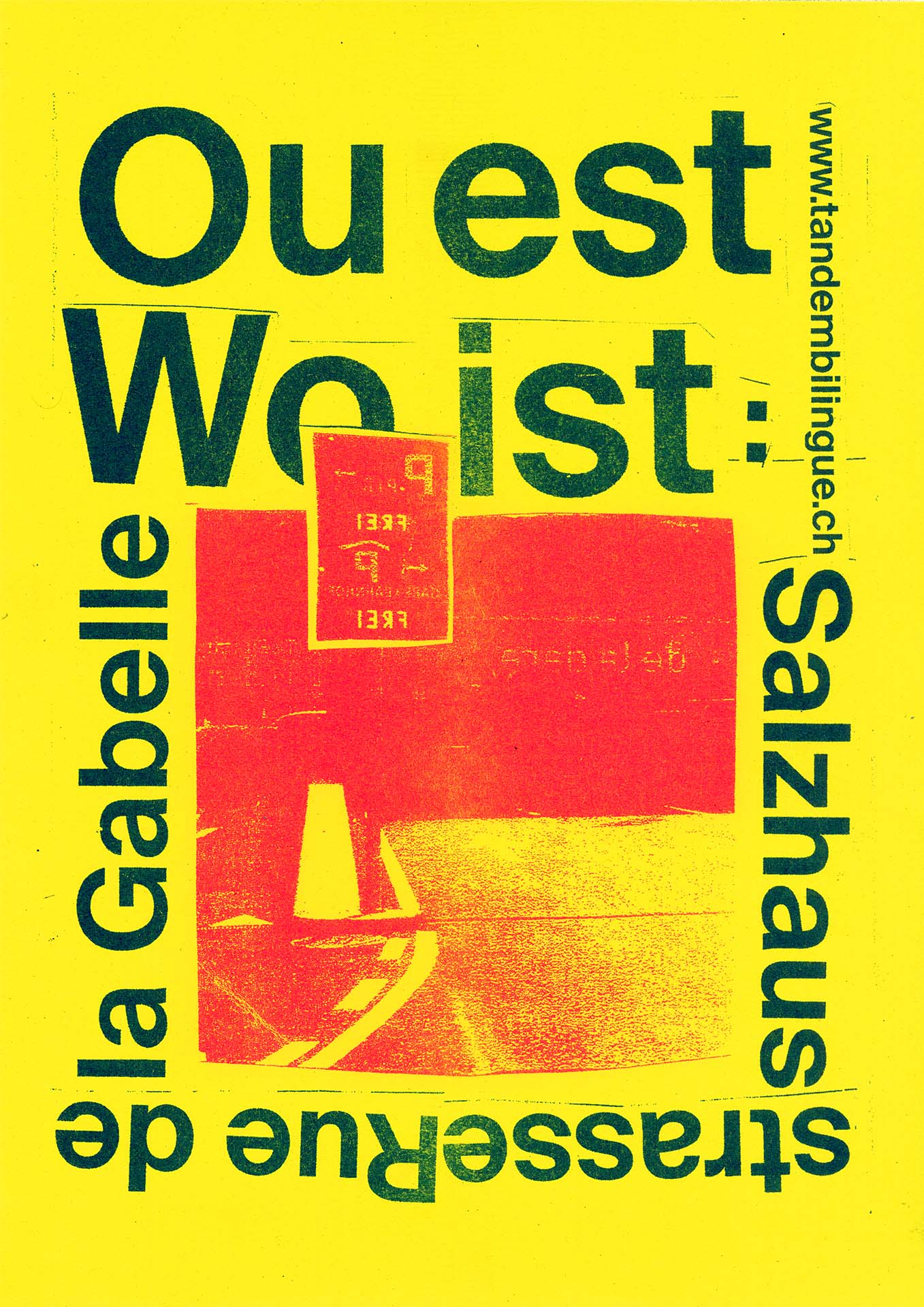What are the ways to make a poster bilingual in an engaging way? I tried to answer this question with this project. Based on several attempts to use bilingualism, images and symbolism in a reduced way, I designed these two final posters, which are intended to function in a playful way as indications of location in German and French. The posters were printed using the risography method.
