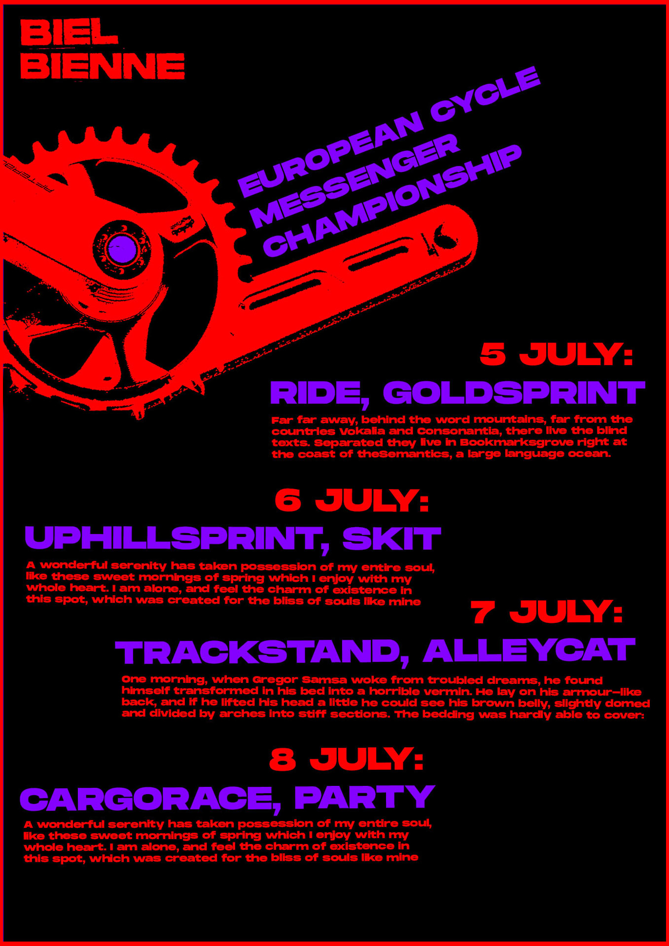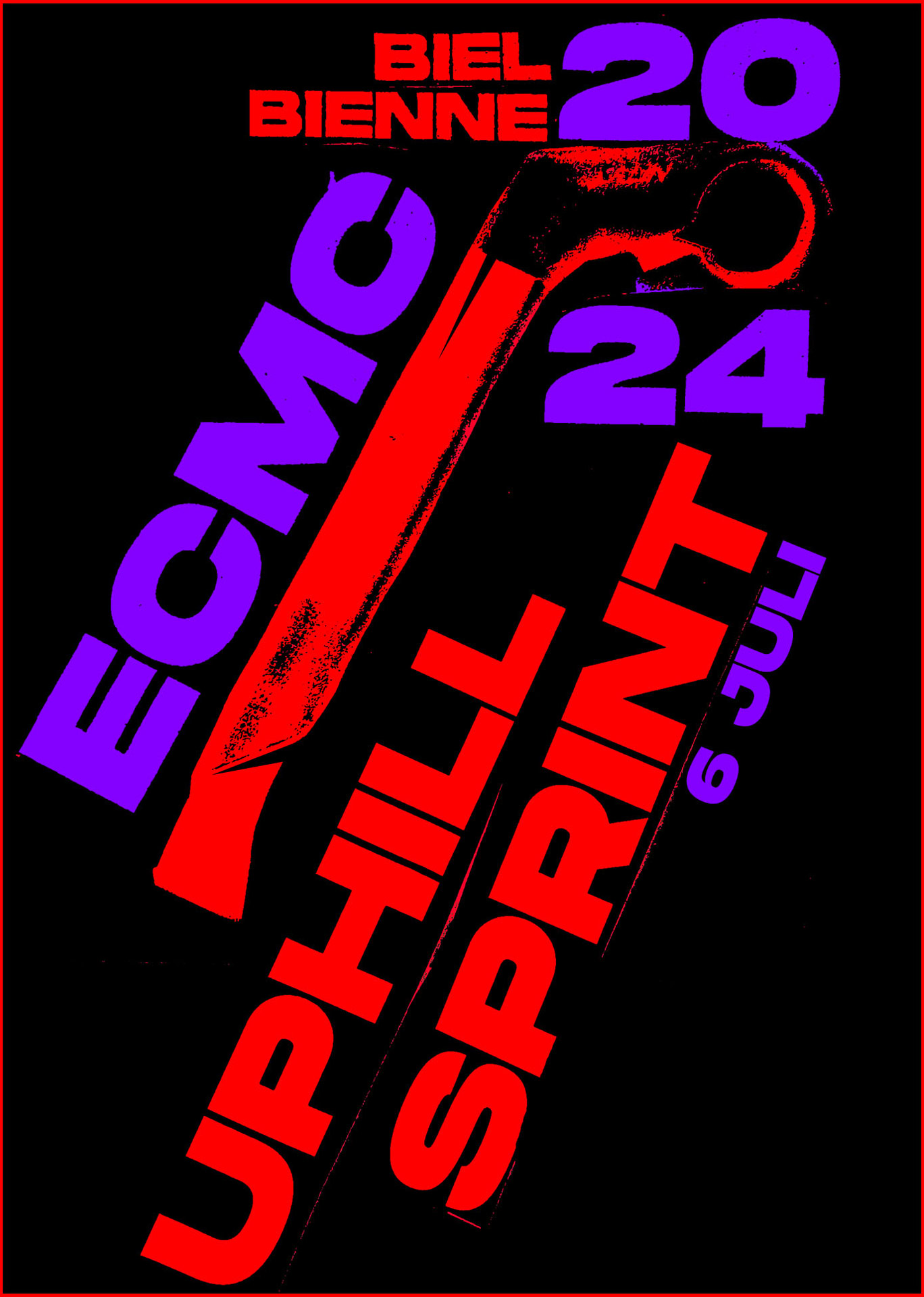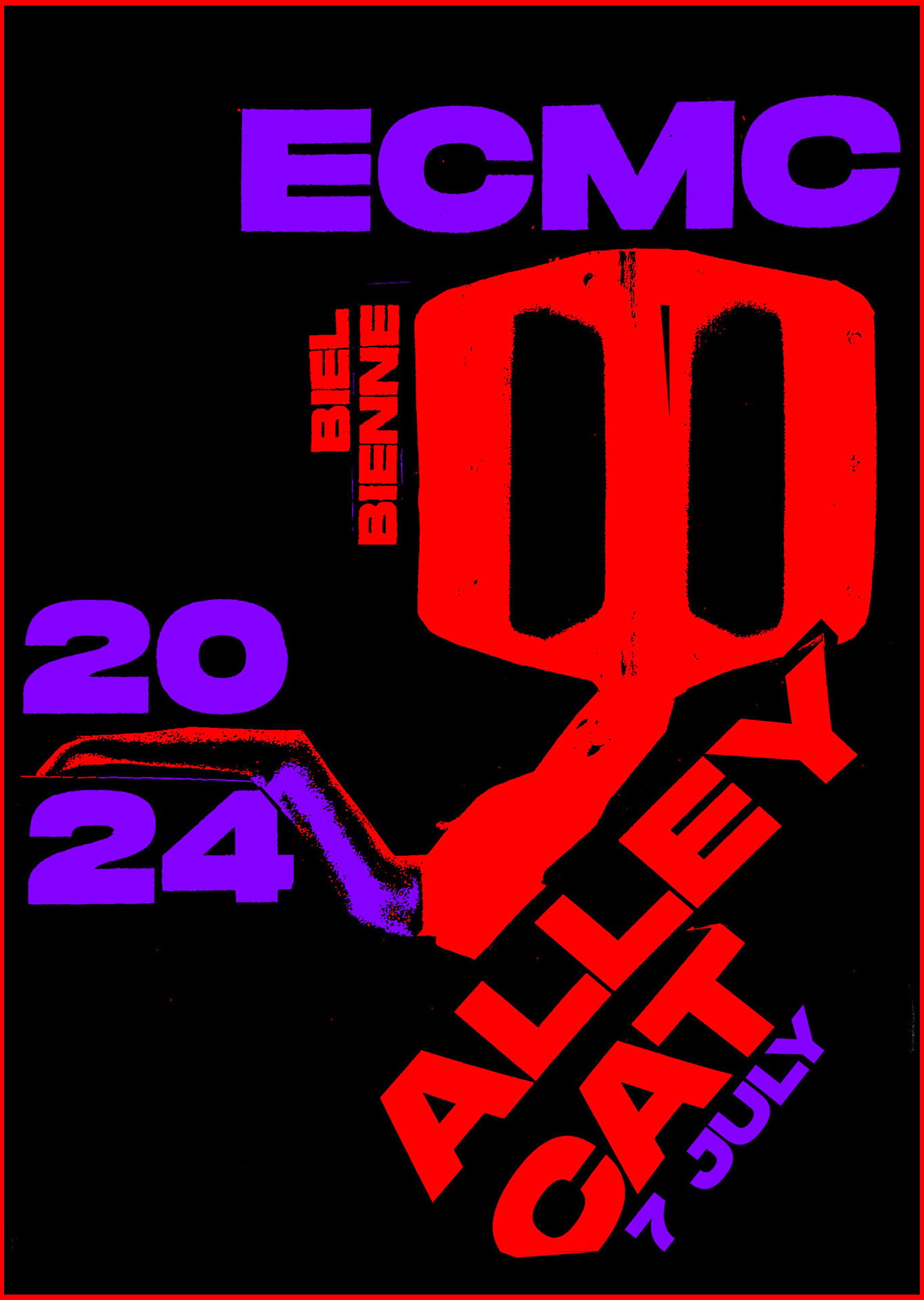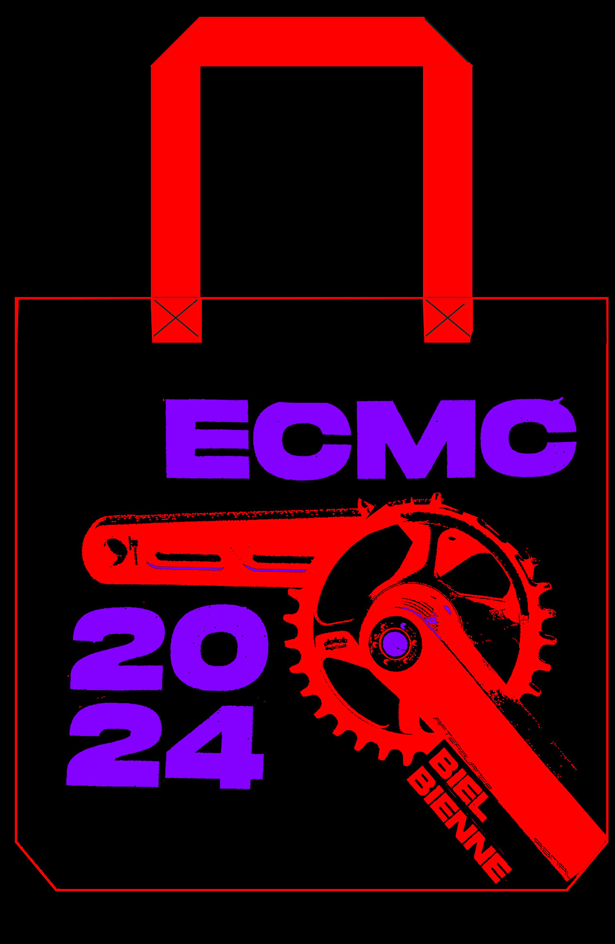 The ECMC is the "European Cycling Messenger Championship" which takes place in a different city every year. It is a championship for bicycle messengers that lasts several days. I designed this fictional corporate identity for the ECMC 2024 which would take place in the city of Biel/Bienne. The visual identity includes posters, flyers as well as merchandise.