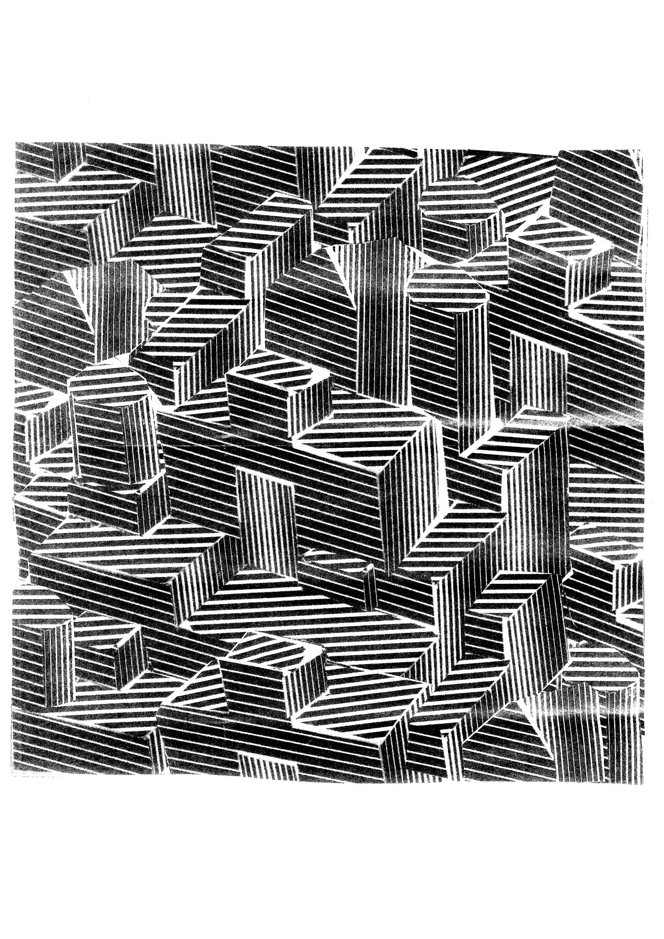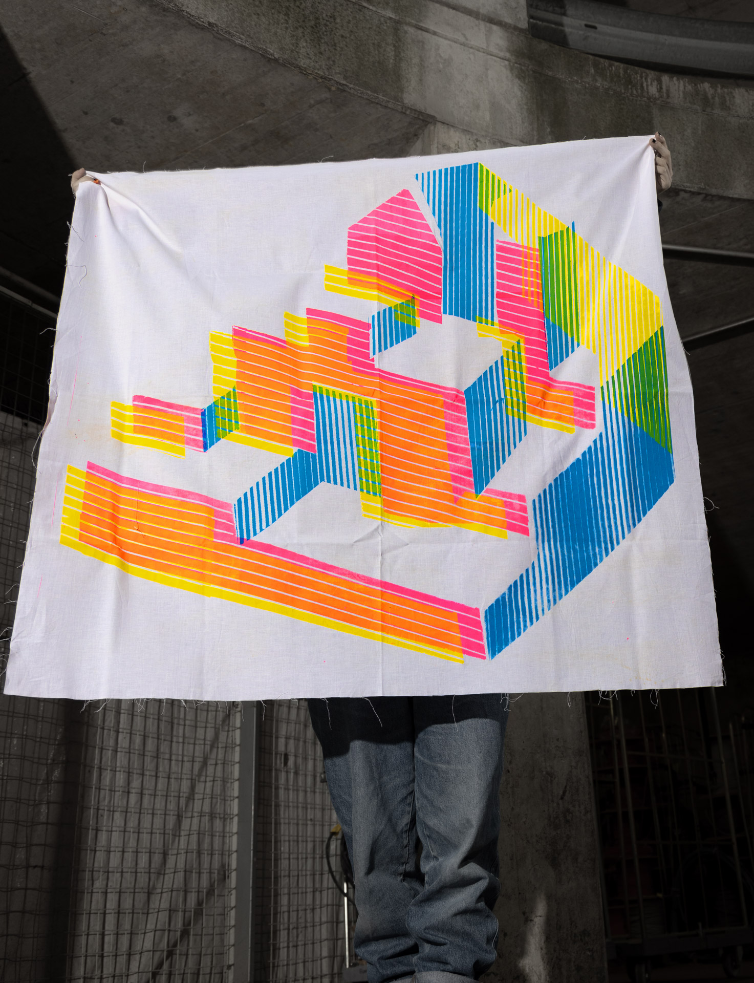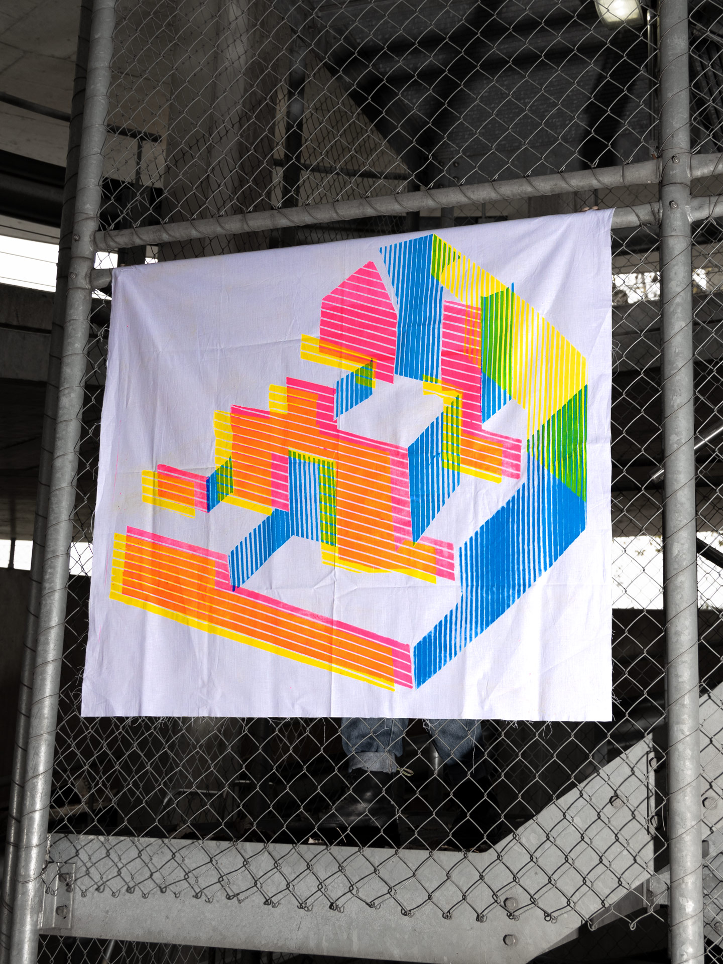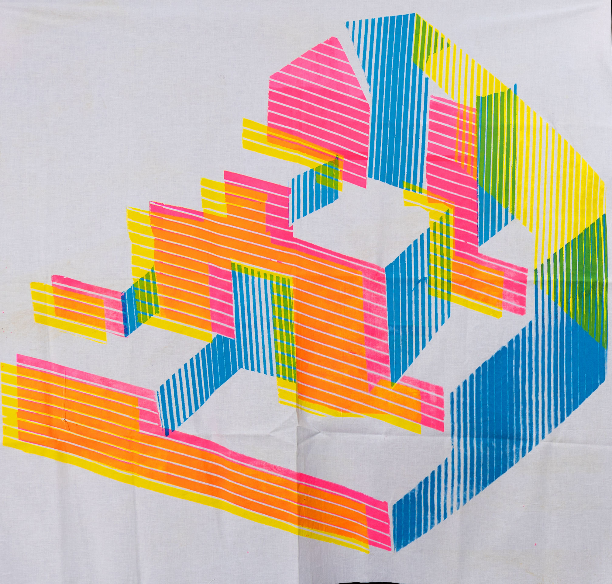 How do lines relate to volume? This work aims to get to the bottom of this question. The alignment of the grid creates three-dimensional structures that stand in relation to each other in space. Through the use of colour, a focus is placed on the forms. As a conclusion to the work, I printed the object with the screen printing technique on a 110 cm x 110 cm fabric.