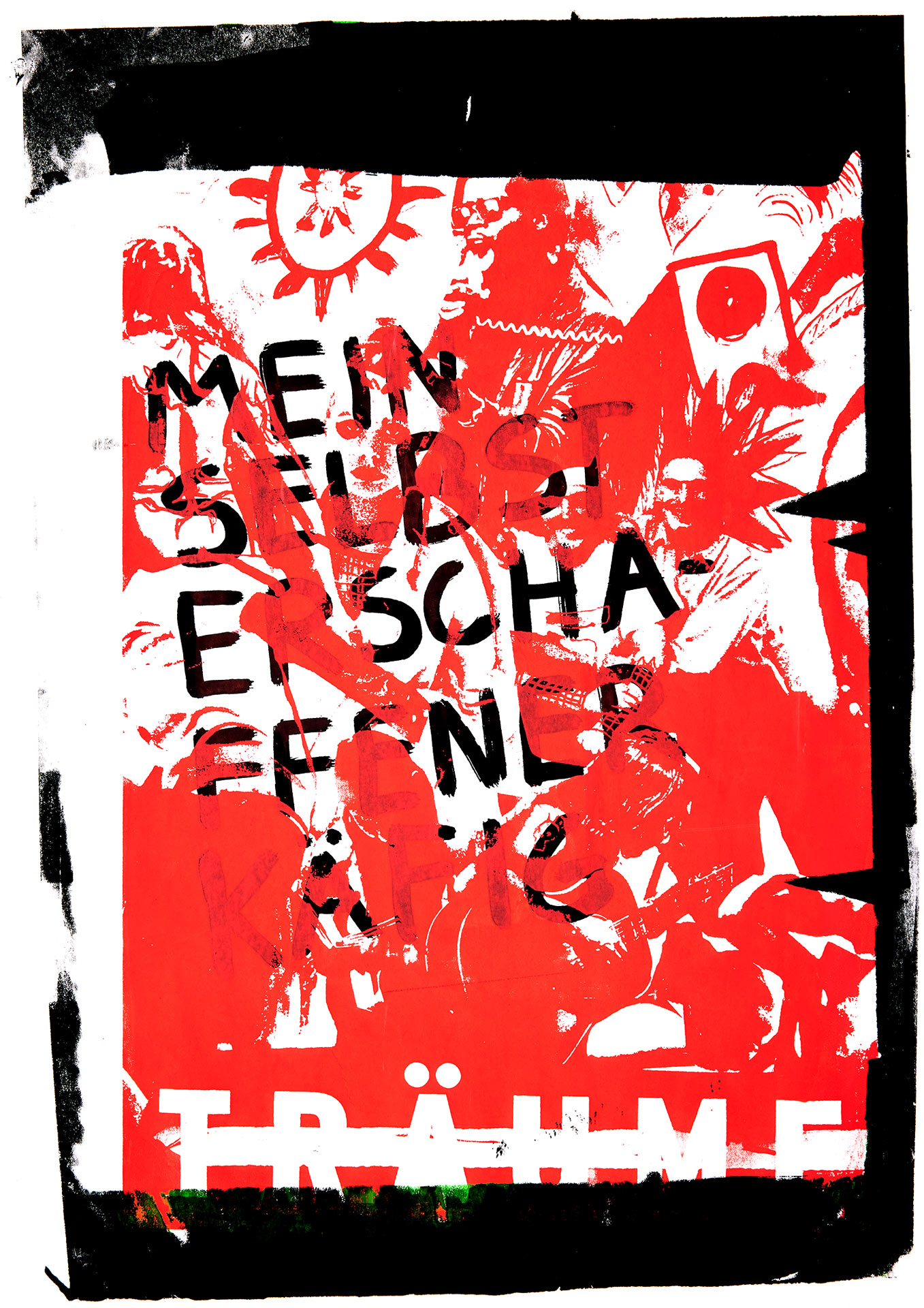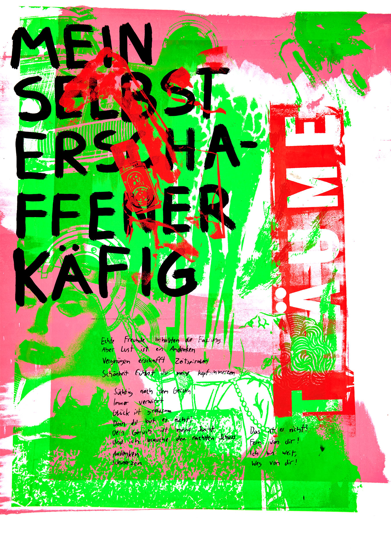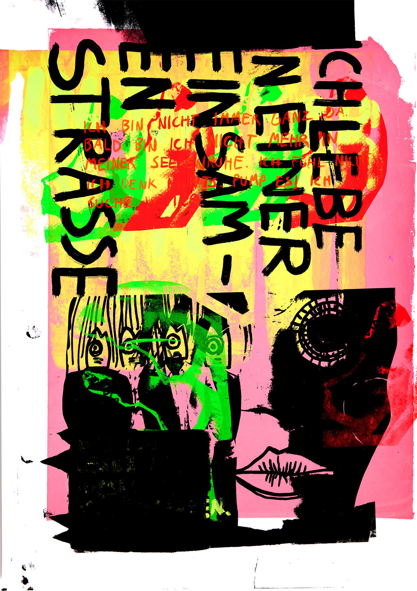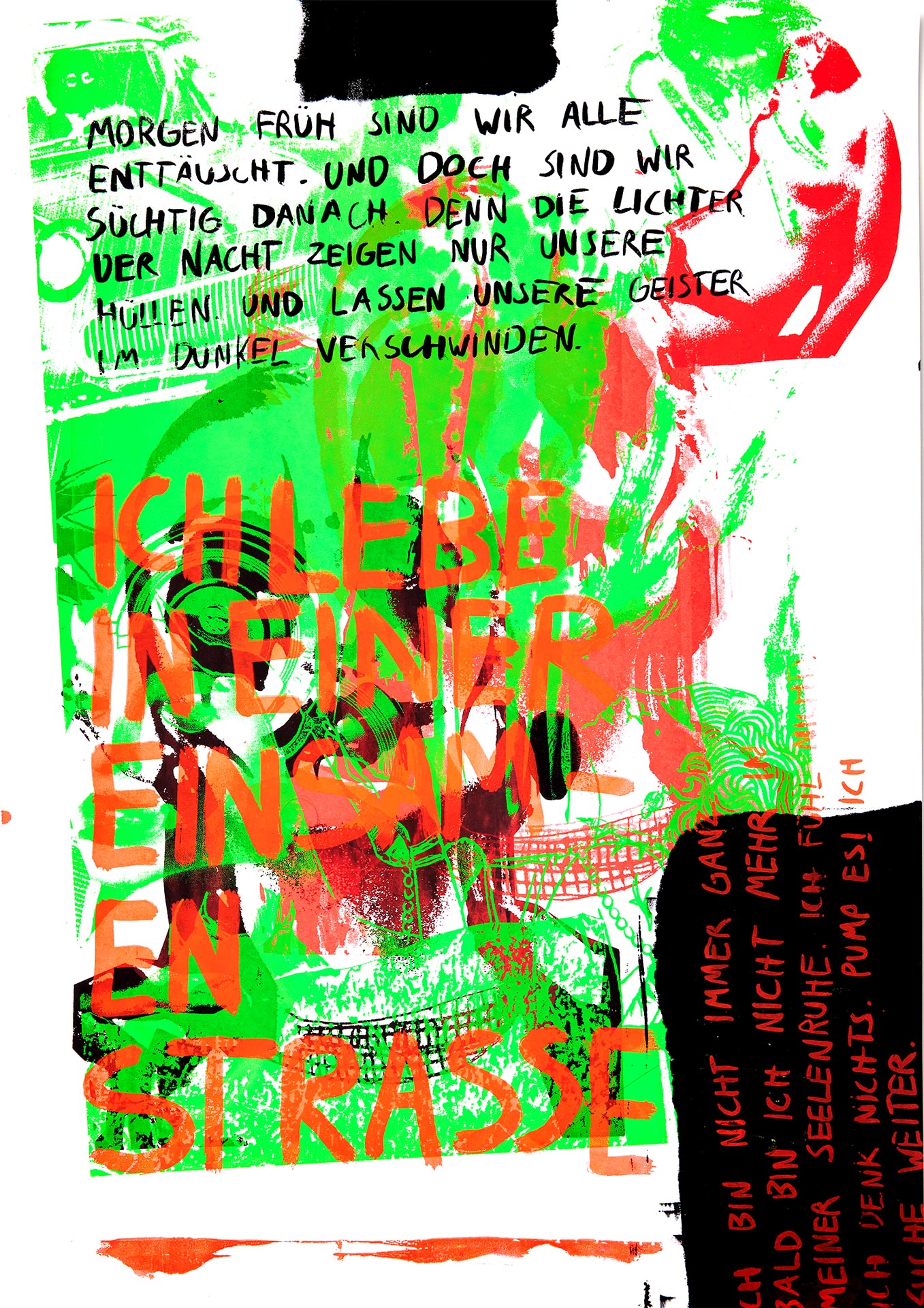 This illustrated work was based on poems and texts that I wrote over a longer period of time. They deal with themes that I was currently preoccupied with, themes such as abandonment, loss of control, loneliness and confusion. The creative basis were collages that I made from old magazines and booklets, over which I also drew with ink. From these collages, I ultimately produced a series of multicolour posters, which I made using the silk-screen printing technique.