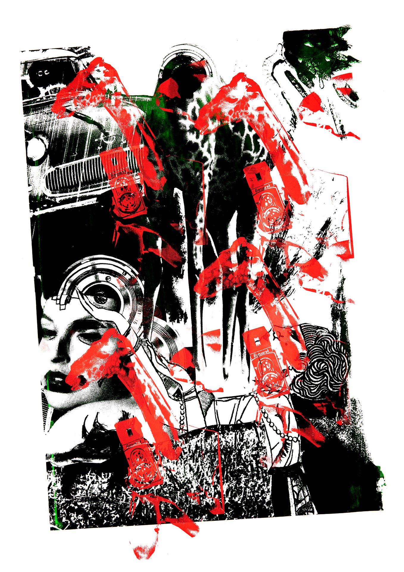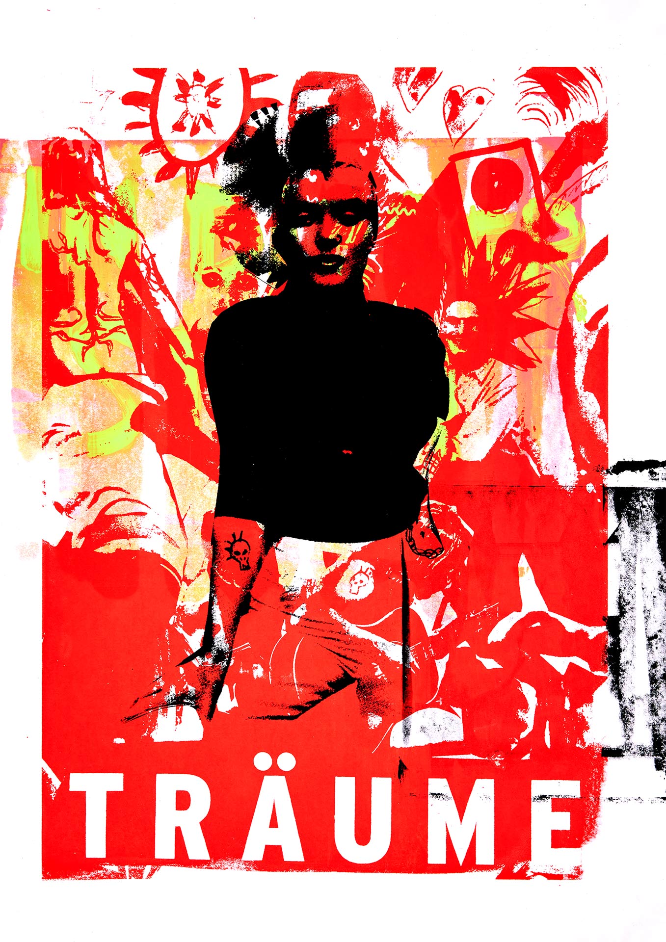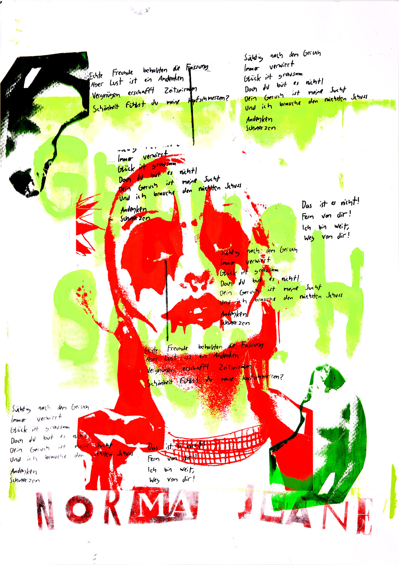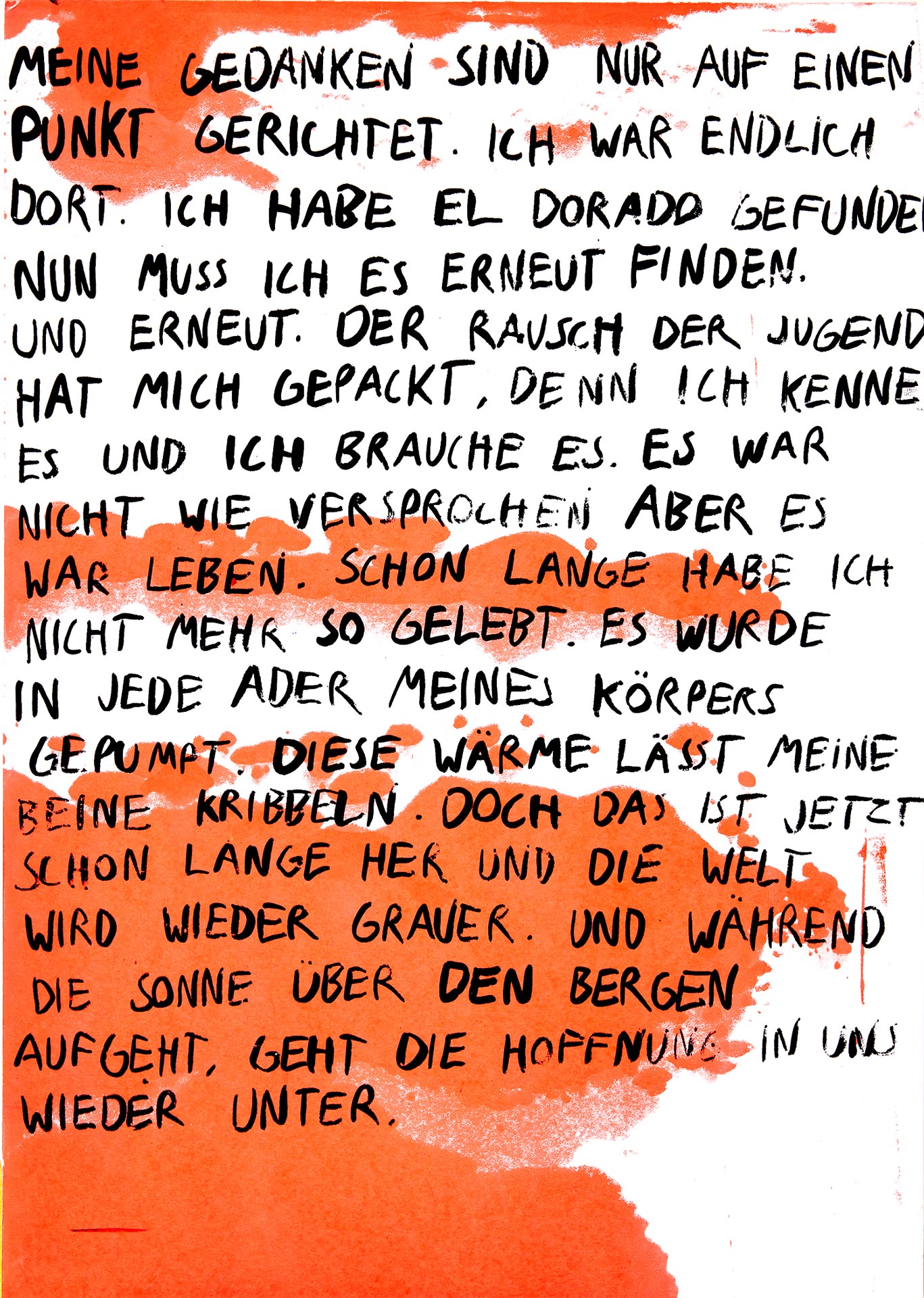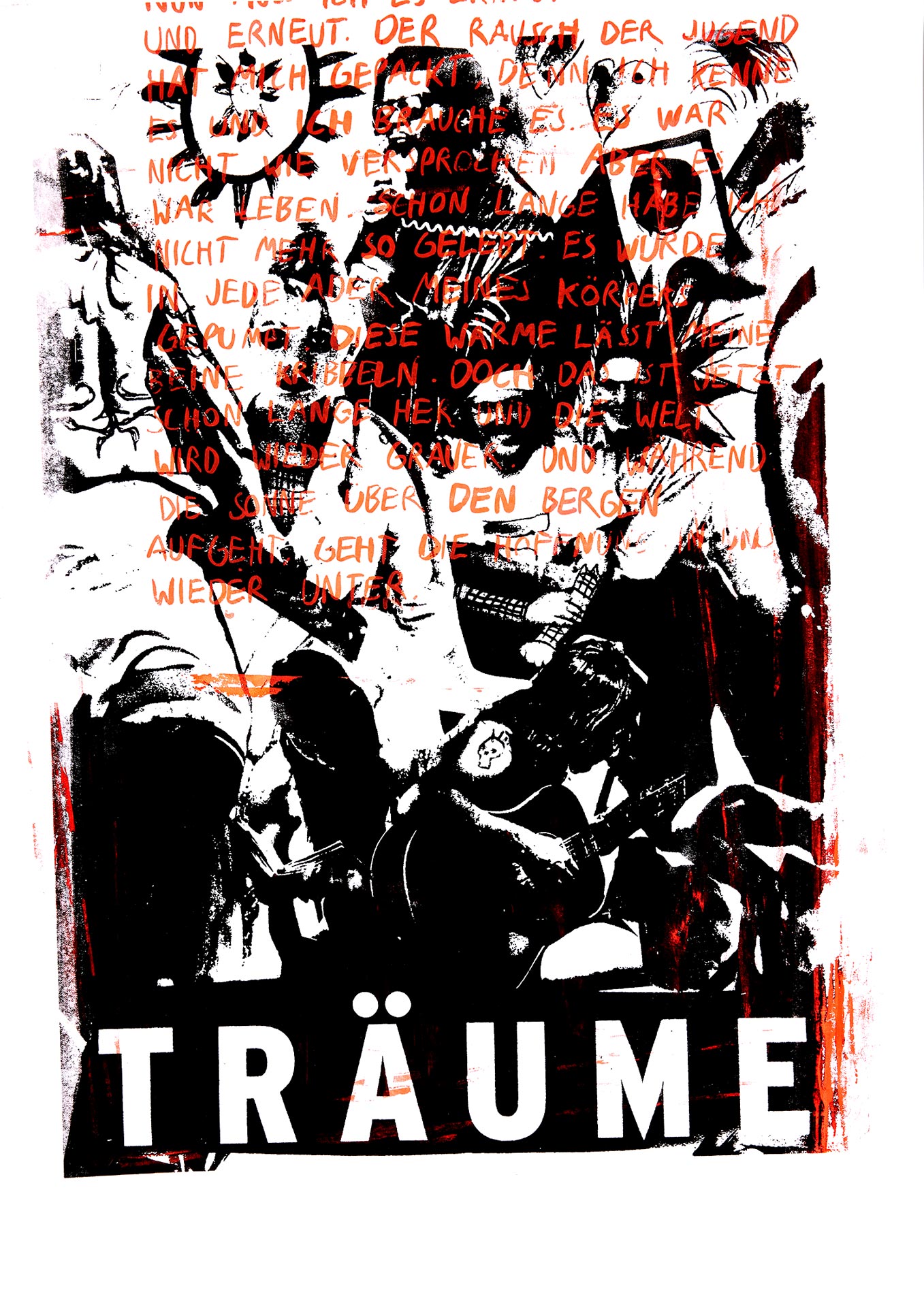 This illustrated work was based on poems and texts that I wrote over a longer period of time. They deal with themes that I was currently preoccupied with, themes such as abandonment, loss of control, loneliness and confusion. The creative basis were collages that I made from old magazines and booklets, over which I also drew with ink. From these collages, I ultimately produced a series of multicolour posters, which I made using the silk-screen printing technique.